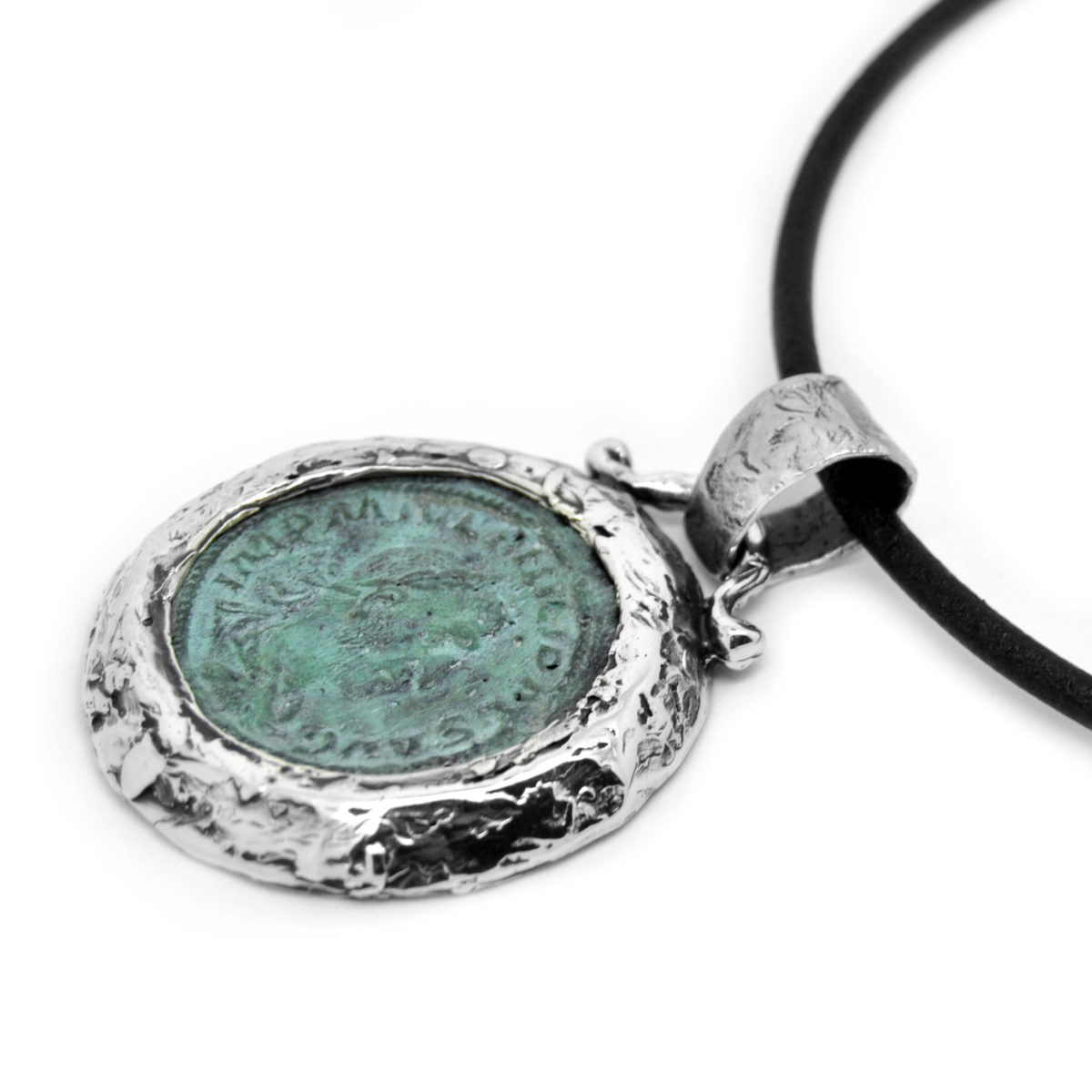 Colgante con un gran cerco artesanal de plata de ley y reproducción de un sestercio romano en bronce con pátina de envejecido o bronce dorado, con un diámetro total de 42 mm. Si desea la moneda en plata, baño de oro o montar su propia moneda, consúltenos sin compromiso. Completa en pedido con nuestras cadenas o cordones de cuero.
