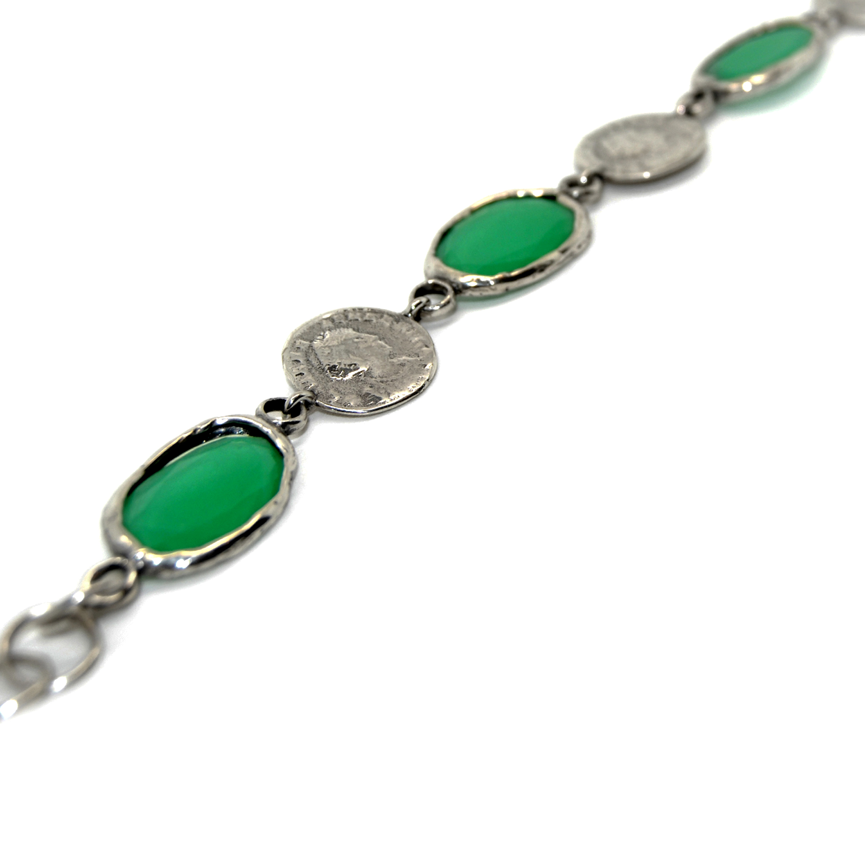 Pulsera de plata de ley montada con rubí o esmeralda reconstituidos y reproducción de monedas romanas de plata. Tamaño aproximado: 19,5cm