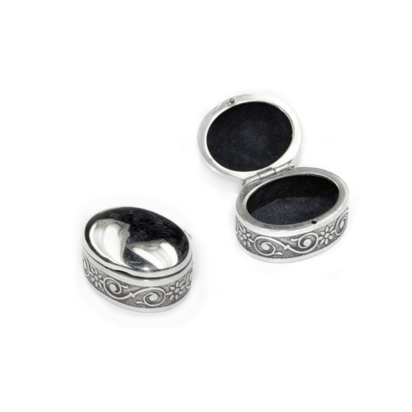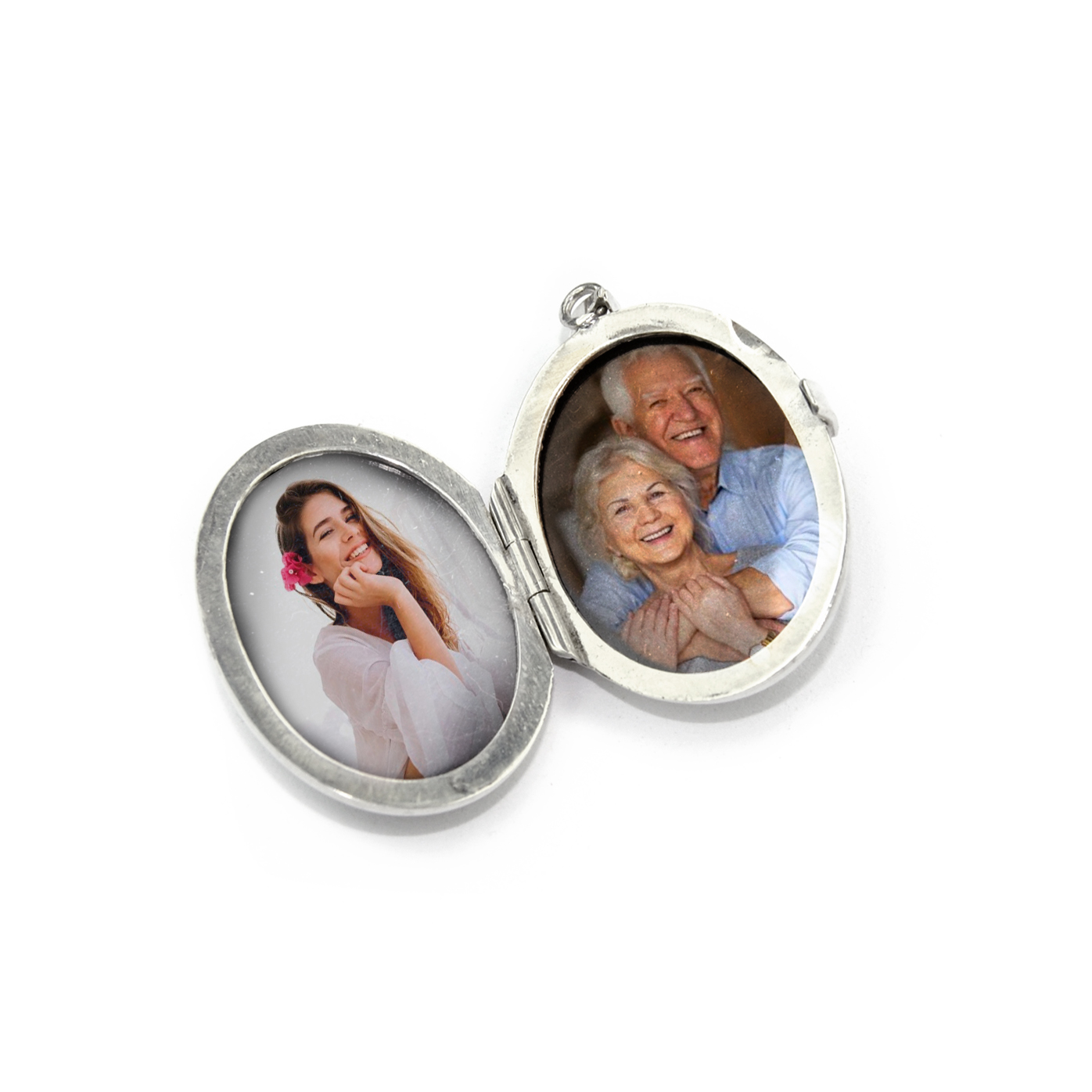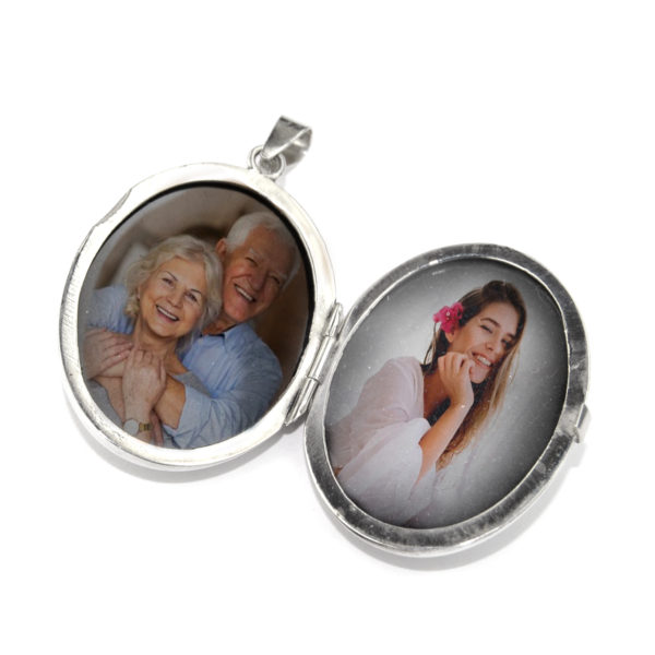Colgante dije labrado de plata de ley. Se trata de un clásico guardapelo o portafotos ovalado, un colgante que podemos abrir y cerrar para atesorar dentro dos pequeñas fotografías o algún pequeño objeto.